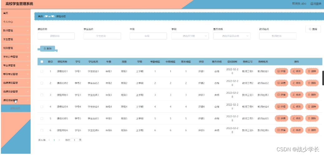 课程成绩管理,在课程成绩管理页面可以对索引,课程名称,学号,学生姓名,年级,班级,学期,考勤成绩,中期成绩,期末成绩,评语,是否合格,登记时间,教师工号,教师姓名等内容进行详情,修改和删除等操作,如图5-10所示。