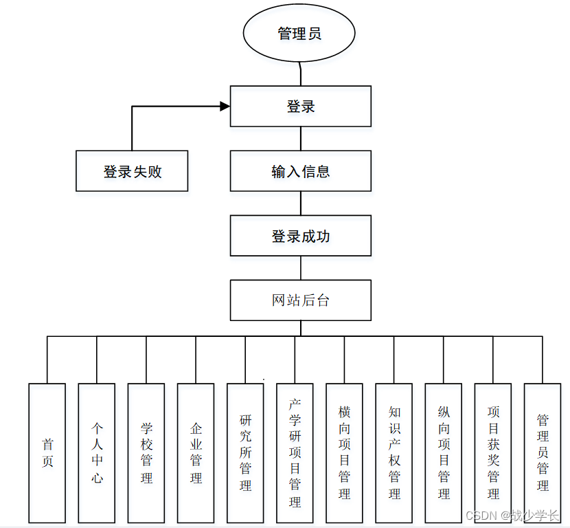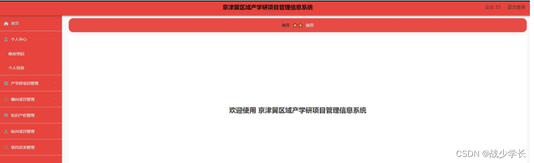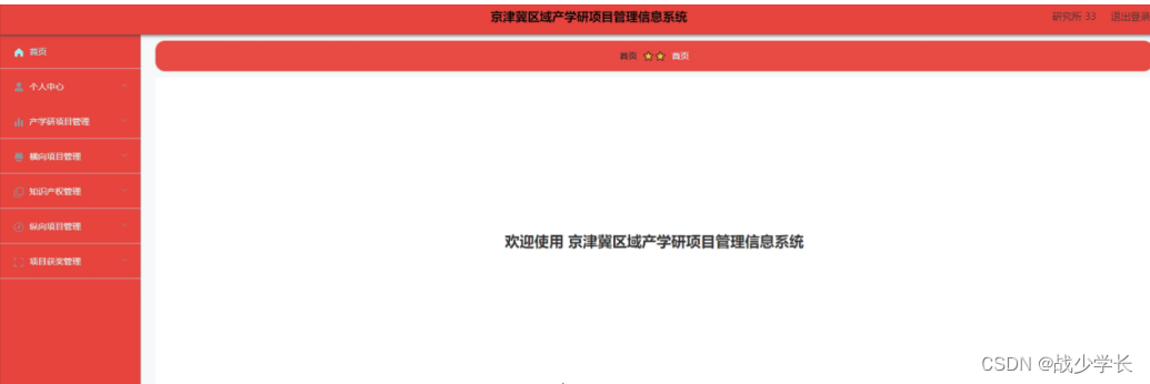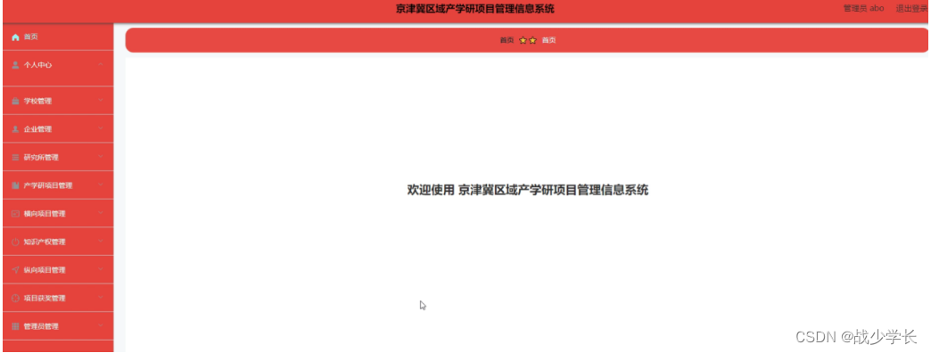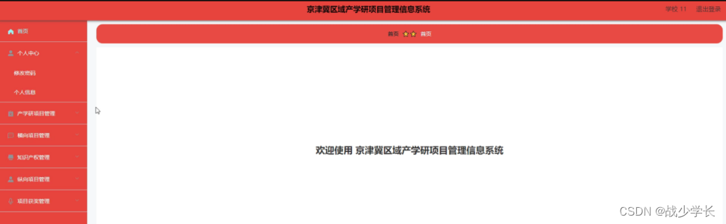 (1)功能要求:可以管理首页、个人中心、学校管理、企业管理、研究所管理、产学研项目管理、横向项目管理、知识产权管理、纵向项目管理、项目获奖管理、管理员管理等功能模块。