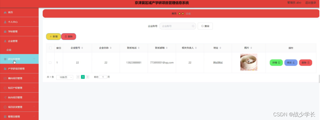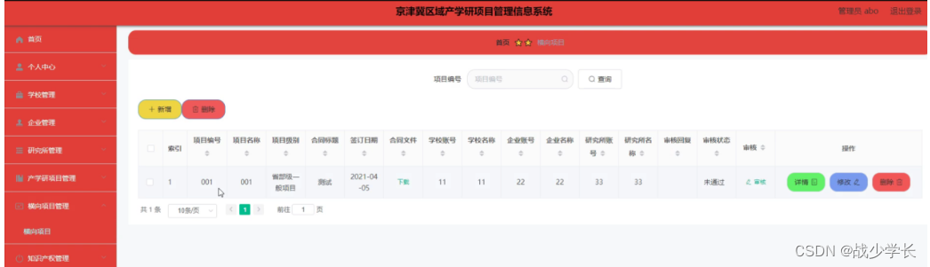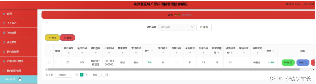 产学研项目管理,在产学研项目管理页面中可以查看索引、项目编号、项目名称、项目级别、开始时间、总负责人、项目经费、项目附件、企业账号、企业名称、学校账号、学校名称、研究所账号、研究所名称、审核回复、审核状态、审核等信息,可进行详情、修改或删除等操作,如图5-6所示。