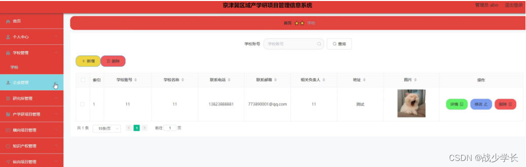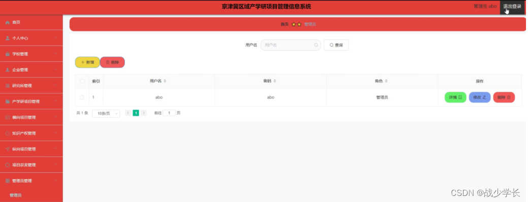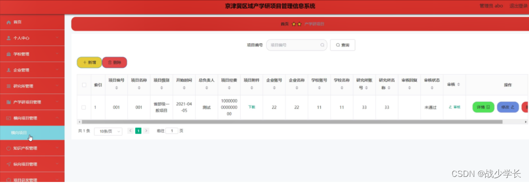 3、功能的完善性:可以管理首页、个人中心、学校管理、企业管理、研究所管理、产学研项目管理、横向项目管理、知识产权管理、纵向项目管理、项目获奖管理、管理员管理模块的修改维护操作。