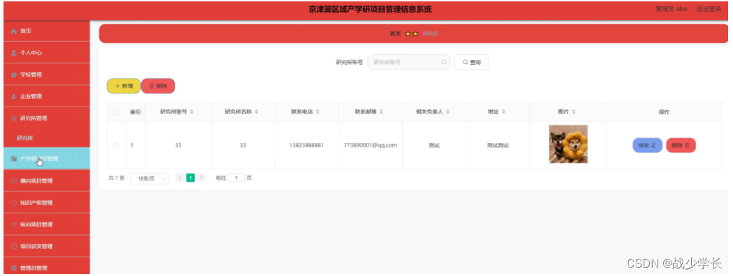 研究所管理,在研究所管理页面中可以查看索引、研究所账号、研究所名称、联系电话、联系邮箱、相关负责人、地址、图片等信息,可进行修改或删除等操作,如图5-5所示。