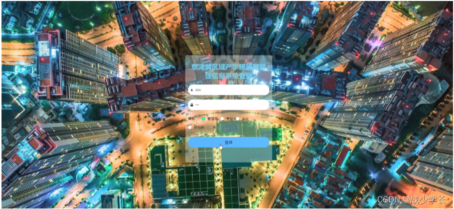 管理员登录,通过填写用户名、密码、选择角色等信息,输入完成后选择登录即可进入京津冀区域产学研项目管理信息系统,如图5-1所示。