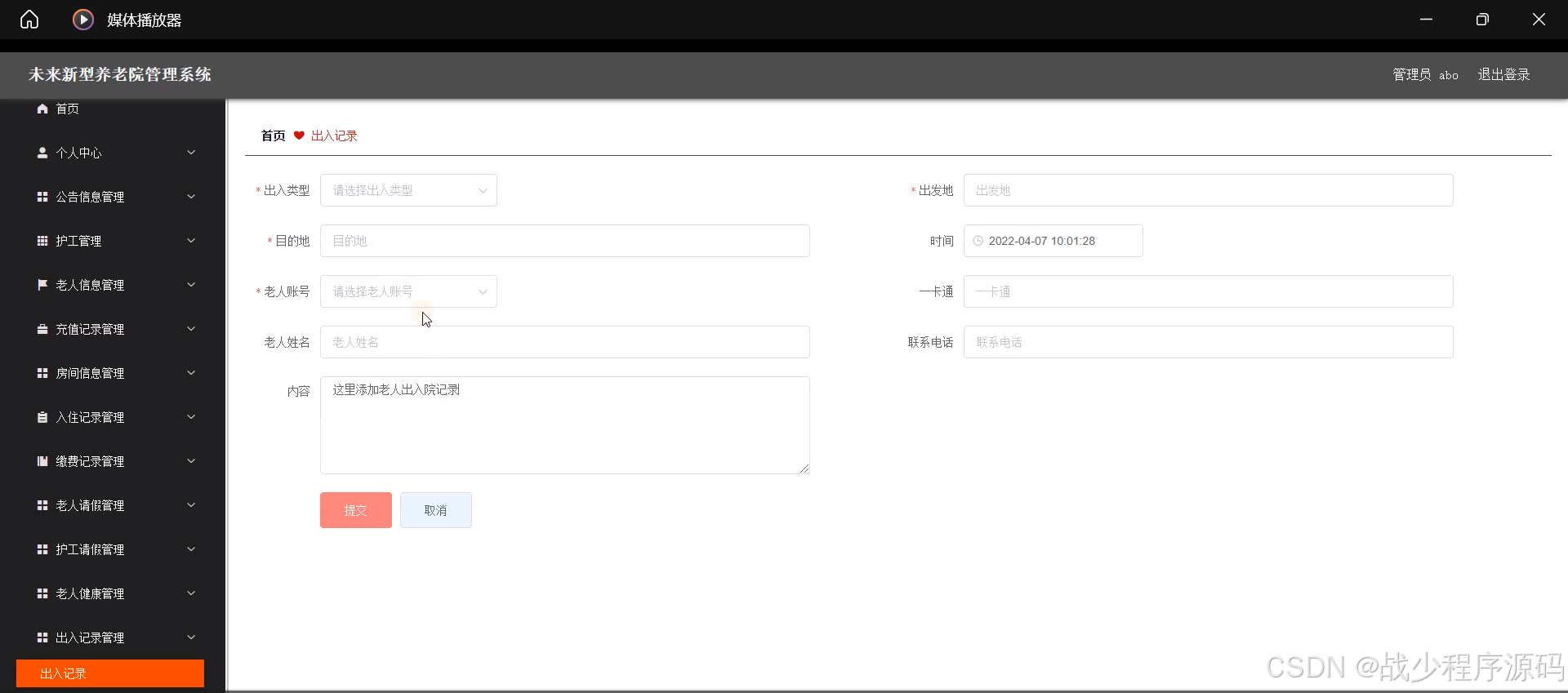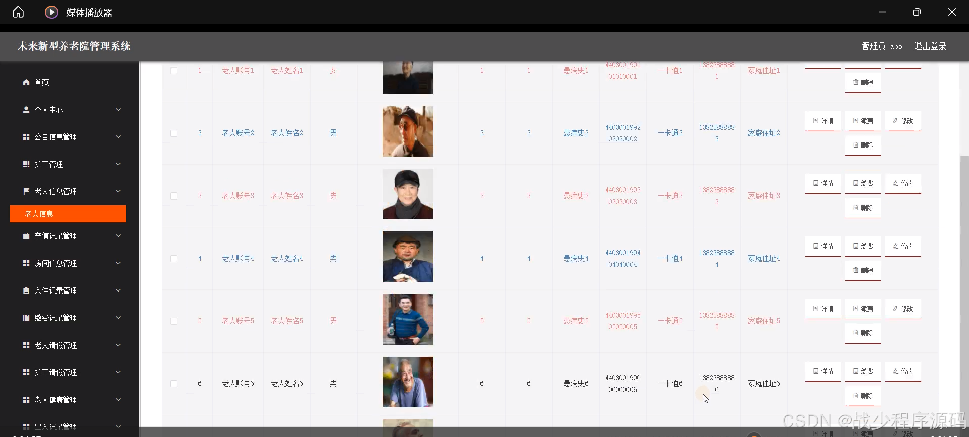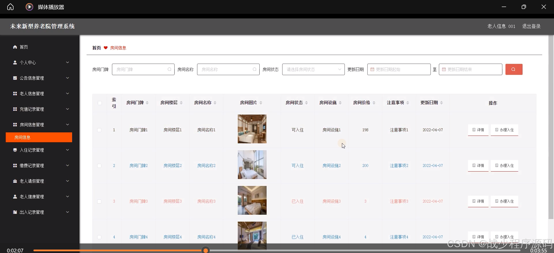 本研究内容将围绕SSM未来新型养老院管理系统的设计与实现展开,具体包括公告信息发布、护工信息管理、老人信息管理、充值记录查询、房间信息管理、入住记录管理、缴费记录查询、老人请假管理、护工请假管理、老人健康监测、出入记录管理等功能模块。通过实现这些功能模块,将构建一个功能全面、操作便捷、智能化程度高的新型养老院管理系统,为养老院提供高效、优质的服务保障。