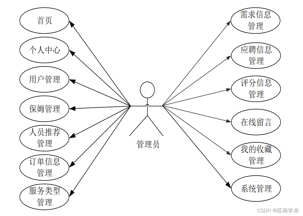 通常在只在家政公司网内部使用,采用C/S。而使用不仅限于内网的情况下使用B/S。考虑到本管理系统的一系列需求,所以,该系统开发使用B/S结构开发。其主要功能结构如下图所示。