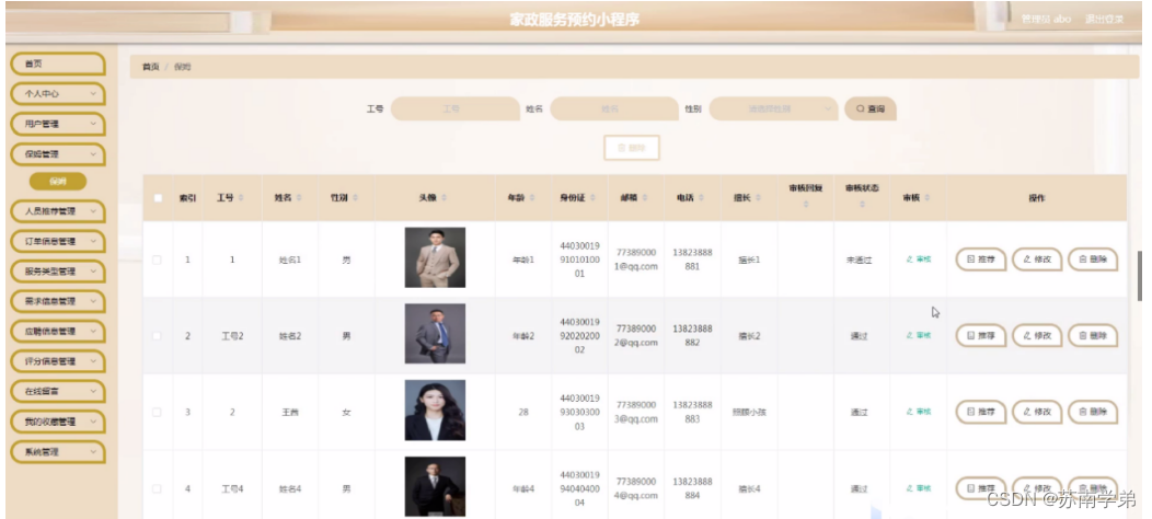 保姆管理,在保姆管理页面可以查看工号、姓名、性别、头像、年龄、身份证、邮箱、电话、擅长、审核回复、审核状态、审核等信息,并可根据需要对保姆管理进行修改或删除等操作,如图5-4所示。