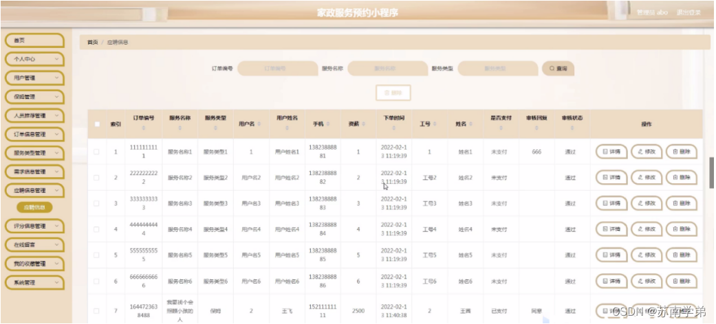 应聘信息管理,在应聘信息管理页面可以查看订单编号、服务名称、服务类型、用户名、用户姓名、手机、资薪、下单时间、工号、姓名、是否支付、审核回复、审核状态等信息,并可根据需要对应聘信息管理进行修改或删除等操作,如图5-8所示。
