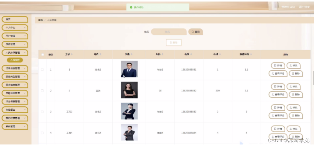 人员推荐管理,在人员推荐管理页面可以查看工号、姓名、头像、年龄、电话、价格、服务评分等信息,并可根据需要对人员推荐管理进行修改或删除等操作,如图5-5所示。