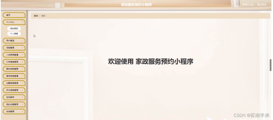 管理员登录进入家政服务预约小程序可以查看首页、个人中心、用户管理、保姆管理、人员推荐管理、订单信息管理、服务类型管理、需求信息管理、应聘信息管理、评分信息管理、在线留言、我的收藏管理、系统管理等内容进行详细操作,如图5-2所示。