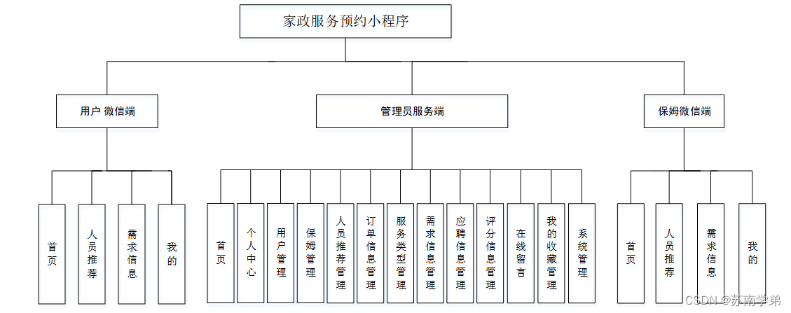 本课题要求实现一套家政服务预约小程序,系统主要包括管理员模块和用户模块、保姆模块等功能模块。