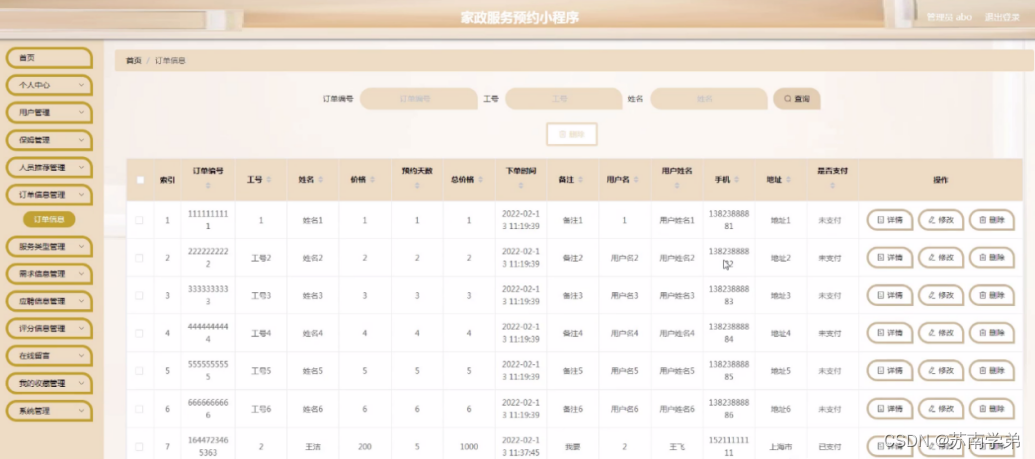 订单信息管理,在订单信息管理页面可以查看订单编号、工号、姓名、价格、预约天数、总价格、下单时间、备注、用户名、用户姓名、手机、地址、是否支付等信息,并可根据需要对订单信息管理进行修改或删除等操作,如图5-6所示。
