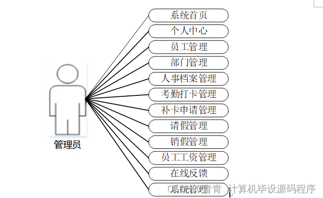 管理员模块:管理员是系统中的核心用户,管理员登录后,可以对后台系统进行管理。主要功能有:个人中心、员工管理、部门管理、人事档案管理、考勤打卡管理、补卡申请管理、请假管理、销假管理、员工工资管理、在线反馈、系统管理等功能。管理员用例如图3-1所示。