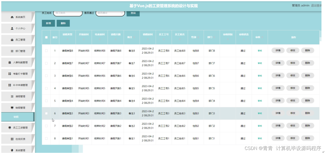 管理员点击销假管理,在销假页面输入员工姓名和是否通过可以查询、新增或删除销假列表,并根据需要对销假详情信息进行查看详情、修改或删除等操作;如图5-12所示: