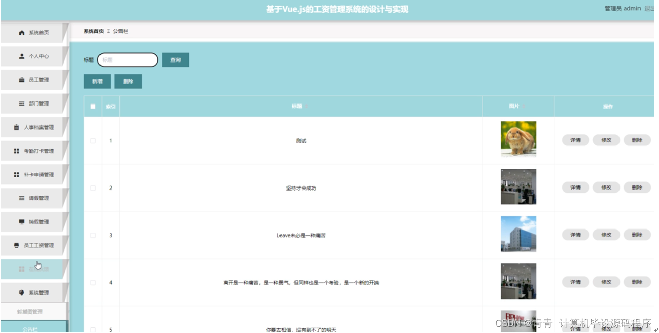 管理员点击系统管理,在公告栏页面输入标题可以查询、新增或删除公告栏列表,并根据需要对公告栏详情信息进行查看详情、修改或删除等操作;还可以对轮播图管理进行操作。如图5-14所示: