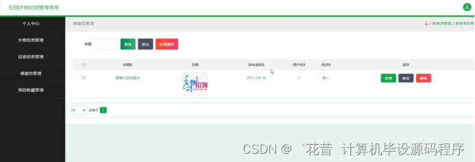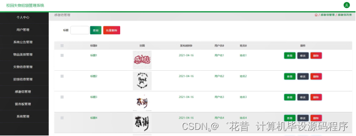 感谢信管理,在感谢信管理页面中可以对标题、封面、发布时间、用户名、姓名等信息进行查看、修改或删除等操作,如图4-13所示。