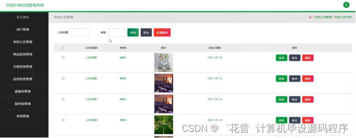 系统公告管理,在系统公告管理页面中可以对公告标题、类型、图片、发布日期等信息进行查看、修改或删除等操作,如图4-9所示。