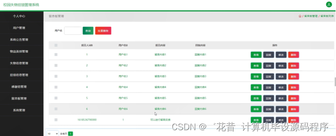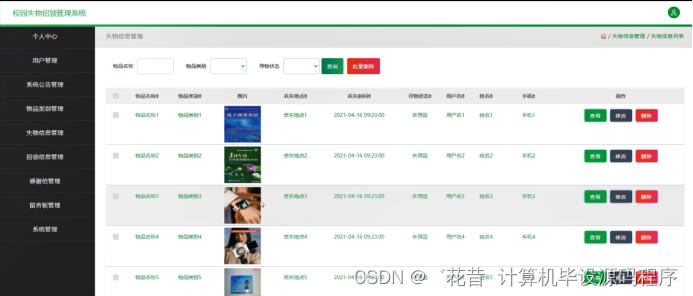 失物信息管理,在失物信息管理页面中可以对物品名称、物品类别、图片、丢失地点、丢失时间、寻物状态、用户名、姓名、手机等信息进行查看、修改或删除等操作,如图4-16所示。