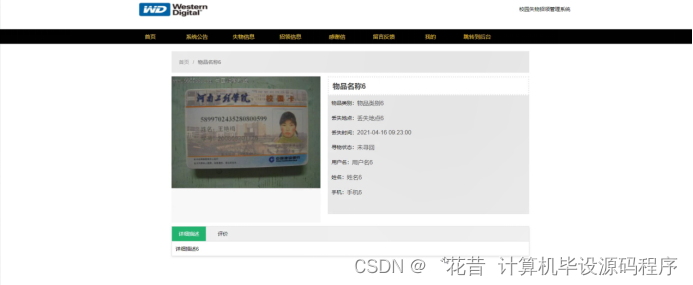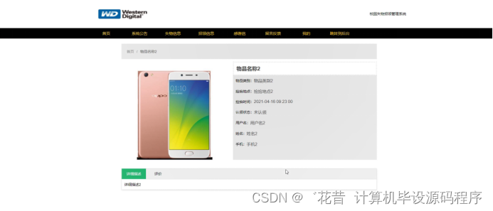招领信息,在招领信息页面可以查看物品名称、物品图片、物品类别、捡拾地点、捡拾时间、认领状态、用户名、姓名、手机、详细描述等详细内容,可进行评价;如图4-3所示。