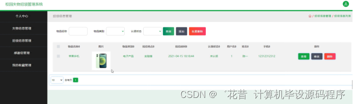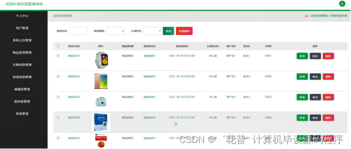 招领信息管理,在招领信息管理页面中可以对物品名称、图片、物品类别、捡拾地点、捡拾时间、认领状态、用户名、姓名、手机等信息进行查看、修改或删除等操作,如图4-12所示。