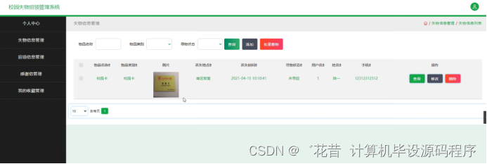 失物信息管理,在失物信息管理页面中可以对物品名称、物品类别、图片、丢失地点、丢失时间、寻物状态、用户名、姓名、手机等信息进行查看、修改或删除等操作,如图4-11所示。