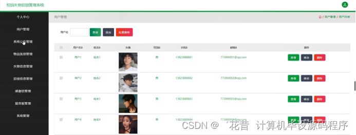 用户管理,在用户管理页面中可以对用户名、姓名、头像、性别、手机、邮箱等信息进行查看、修改或删除等操作,如图4-8所示。