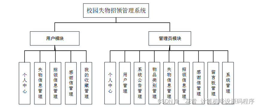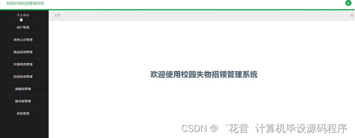 管理员登录进入系统可以查看个人中心、用户管理、系统公告管理、物品类别管理、失物信息管理、招领信息管理、感谢信管理、留言板管理、系统管理等信息进行详细操作,如图4-7所示。