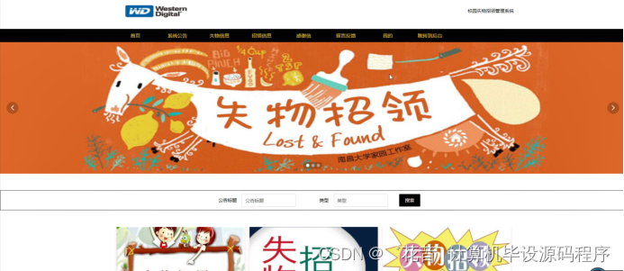 校园失物招领管理系统,在系统首页可以查看首页、系统公告、失物信息、招领信息、感谢信、留言反馈、我的、跳转到后台等内容进行详细操作,如图4-1所示。
