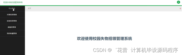 用户登录进入系统后台可以查看个人中心、失物信息管理、招领信息管理、感谢信管理、我的收藏管理等内容进行详细操作,如图4-15所示。
