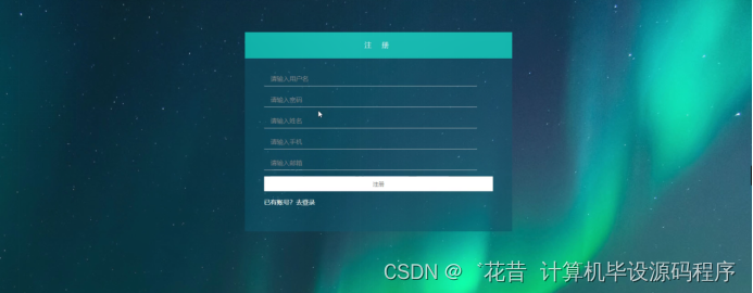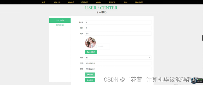 用户注册,在用户注册页面通过填写用户名、密码、姓名、手机、邮箱等信息完成用户注册,如图4-4所示。在个人中心页面通过填写用户名、密码、姓名、图片、性别、手机、邮箱等信息进行信息更新操作,还可以根据需要对我的收藏进行详细操作;如图4-5所示。