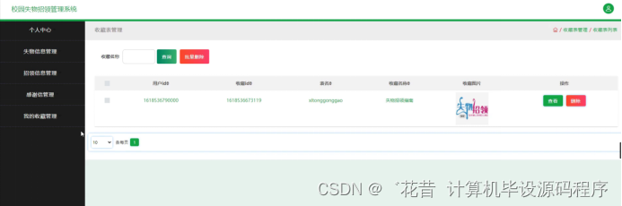 我的收藏管理,在我的收藏管理页面中可以对用户id、收藏id、表名、收藏名称、收藏图片等信息进行查看或删除等操作,如图4-19所示。