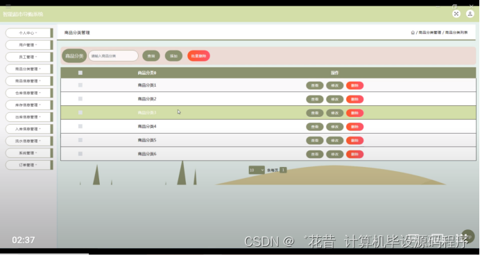 商品分类管理,在商品分类管理页面可以对商品分类信息进行查看,修改,删除操作,如图5-10所示。