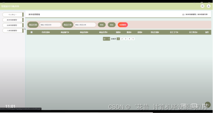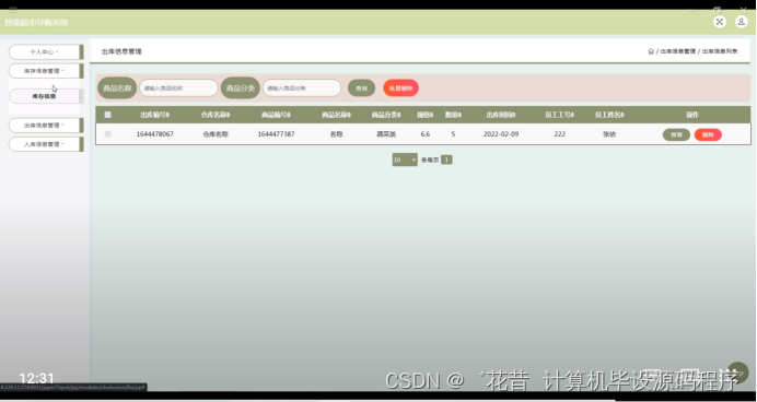 库存信息管理,在库存信息管理页面可以对仓库名称,商品编号,商品名称,商品分类,规格,数量,价格,登记日期,员工工号,员工姓名等内容进行出库,入库,查看,修改和删除操作,如图5-15所示。