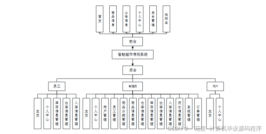 后台由管理员,用户,员工三个角色组成,主要功能包括主页,个人中心,用户管理,员工管理,商品分类管理,商品信息管理,仓库信息管理,库存信息管理,出库信息管理,入库信息管理,流水信息管理,系统管理,订单管理等;