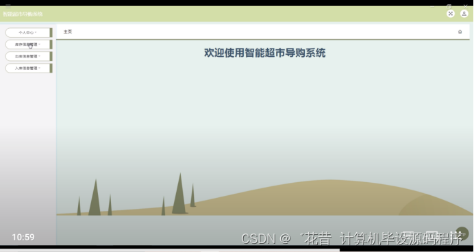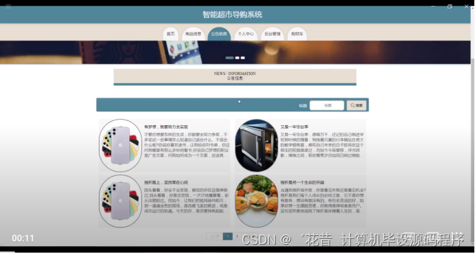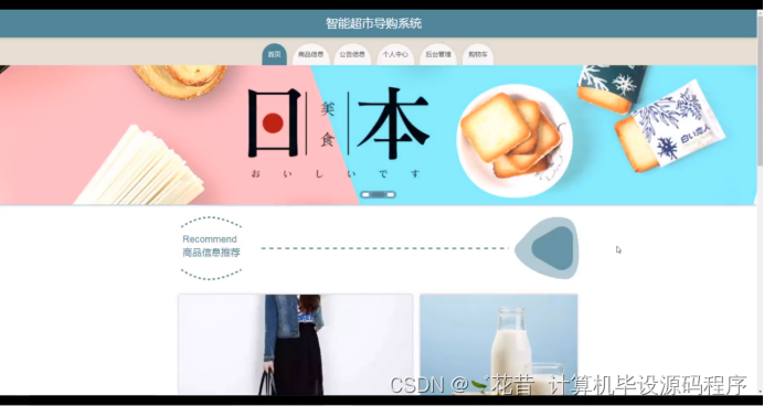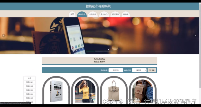 智能超市导购系统,在系统首页可以查看首页,商品信息,公告信息,个人中心,后台管理,购物车等内容,并进行详细操作;如图5-2所示。