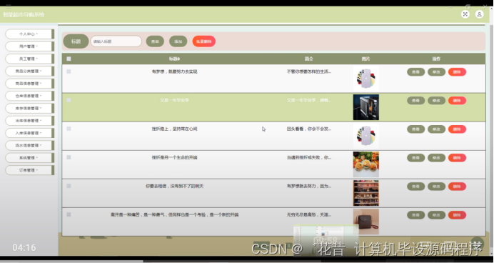 本文介绍了使用Java和Mybatis构建的智能超市导购系统的总体设计和详细功能。系统涵盖前台用户功能,如商品浏览、公告查看、个人中心等,以及后台的管理员和员工功能,包括用户管理、库存控制、订单处理等。数据库设计包括用户、出库、流水等实体的ER图。项目支持不同角色的登录操作,并提供了详细的页面流程和界面截图。