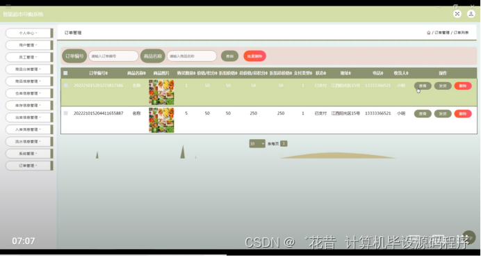 订单管理,在订单管理页面可以对订单编号,商品名称,商品图片,购买数量,价格,折扣总价格,支付类型,状态,地址,电话,收货人等内容进行查看,发货,删除操作,如图5-12所示。