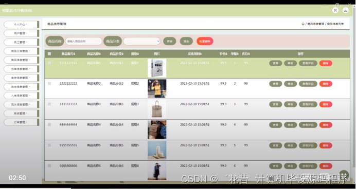 商品信息管理,在商品信息管理页面可以对商品编号,商品名称,商品分类,规格,图片,发布时间,价格,单限,库存等内容进行查看评论,查看,修改,删除操作,如图5-11所示。