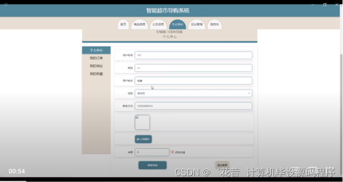 个人中心,在个人中心页面通过填写账号,姓名,密码,性别,联系方式,上传图片等内容进行更新信息操作,还可以对我的收藏,我的订单,我的地址进行详细操作;如图5-6所示。