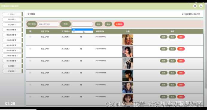 员工管理,在员工管理页面可以对员工工号,员工姓名,性别,照片,电话号码等信息进行查看,修改,删除操作,如图5-9所示。