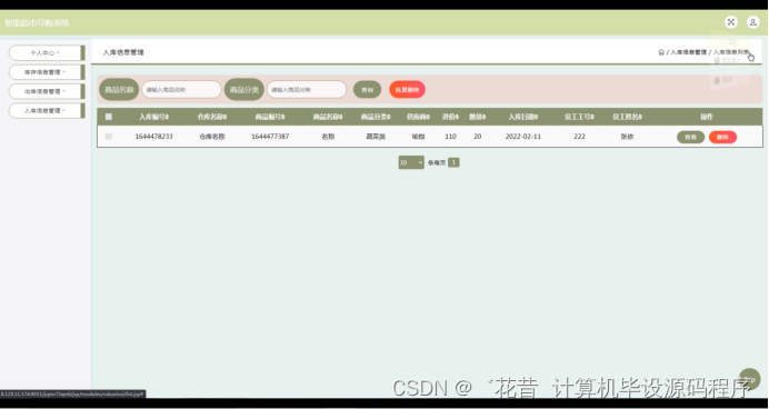 入库信息管理,在入库信息管理页面可以对入库编号,仓库名称,商品编号,商品名称,商品分类,供应商,进价,数量,入库日期,员工工号,员工姓名等内容进行查看和删除操作,如图5-17所示。
