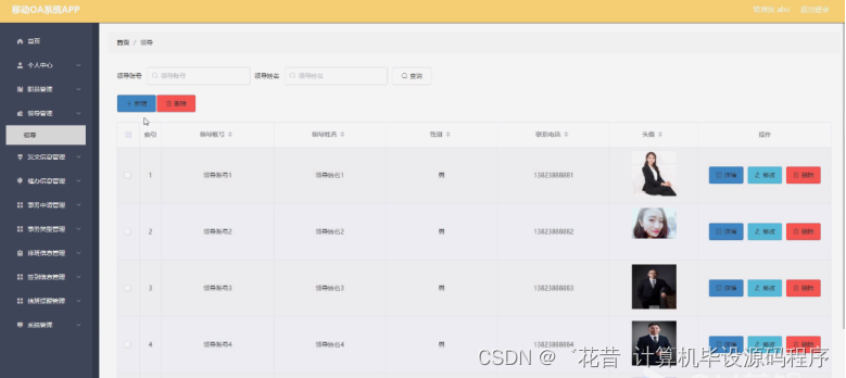 领导管理,管理员可在领导管理页面查看领导账号、领导姓名、性别、联系电话、头像等内容,还可进行新增、修改或删除等操作,如图5-16所示。