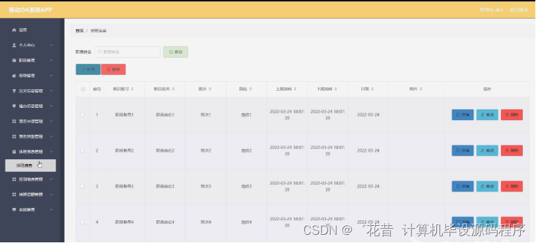 排班信息管理,管理员可在排班信息管理页面查看职员账号、职员姓名、班次、岗位、上班时间、下班时间、日期、图片等内容,还可进行新增、修改或删除等操作,如图5-20所示。