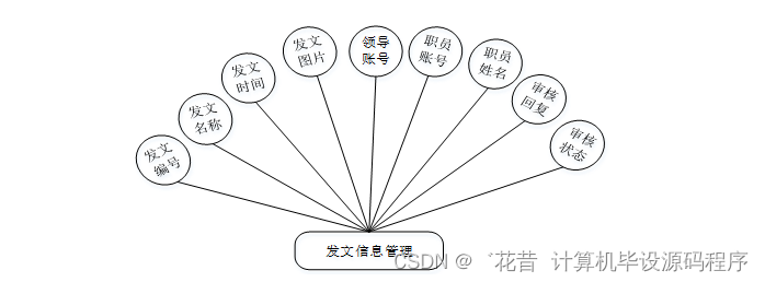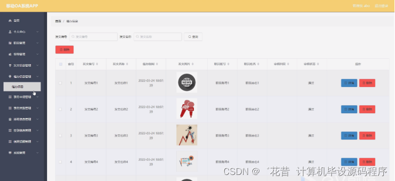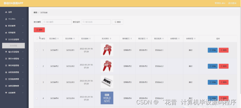 发文信息管理,管理员可在发文信息管理页面查看发文编号、发文名称、发文时间、发文图片、领导账号、职员账号、职员姓名、审核回复、审核状态等内容,还可进行删除等操作,如图5-17所示。