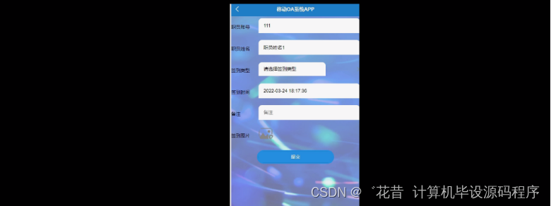 签到,职员可通过输入职员账号、职员姓名、签到类型、签到时间、备注、签到图片等内容进行提交等操作,如图5-13所示。