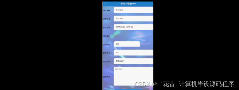 新增发文信息,职员可通过输入发文名称、发文编号、发文时间、发文图片、领导账号、职员账号、职员姓名、发文内容进行新增等操作,如图5-10所示。