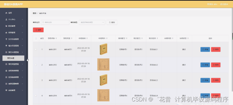 事务申请管理,管理员可在事务申请管理页面查看事务名称、事务类型、申请时间、申请图片、领导账号、职员账号、职员姓名、审核回复、审核状态等内容,还可进行删除等操作,如图5-19所示。