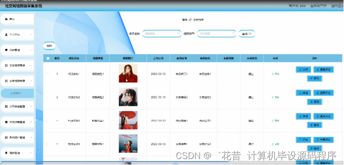 该项目是一个基于Java的社交网络数据采集系统,包括登录功能、会员和管理员功能模块。系统采用CSS+DIV布局,利用JAVA+Mybatis进行开发,支持Mysql数据库。会员可注册、查看交友信息和相册,管理员则能进行会员管理、信息审核等操作。