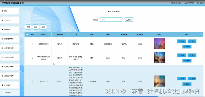 爬虫管理,在爬虫管理页面可以对索引,电影名,电影分类,上演,导演,语言,发行地区,发行年份,图片等内容进行详情,修改和删除等操作,如图5-12所示。