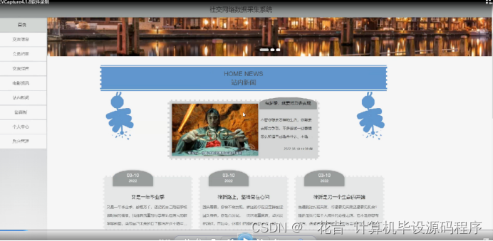 社交网络数据采集系统,在系统首页可以查看首页,交友信息,会员相册,交友指南,电影资讯,站内新闻,留言板,个人中心,后台管理等内容,并进行详细操作;如图5-3所示。