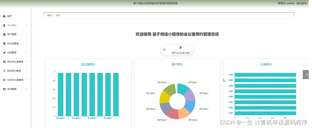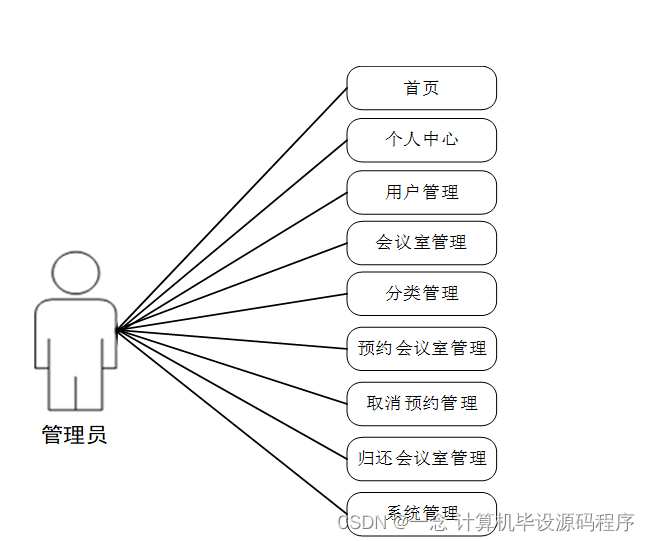 管理员登录到微信小程序的会议室预约管理系统可以查看首页、个人中心、用户管理、会议室管理、分类管理、预约会议室管理、取消预约管理、归还会议室管理、系统管理等功能进行详细操作,如图5-2所示。