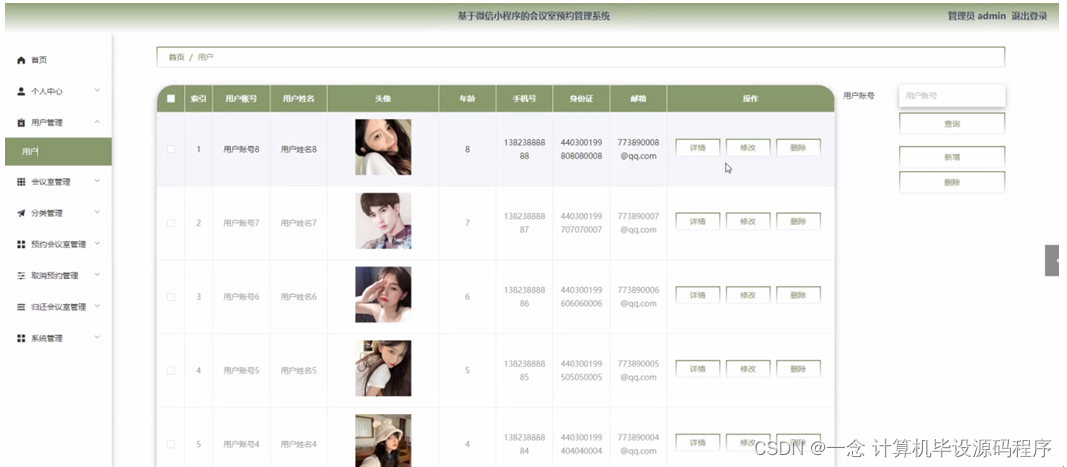 管理员点击用户管理;在用户管理页面输入用户账号、用户姓名、头像、年龄、手机号、身份证、邮箱等信息,进行查询,新增或删除用户信息等操作;如图5-3所示。
